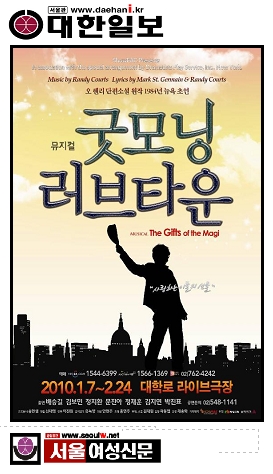 <¹ÂÁöÄôº½º> °ø¿¬ Á¦ÀÛ»ç ¼îÆÑÀº 2010³â 1¿ù 7ÀϺÎÅÍ 2¿ù 24ÀϱîÁö ´ëÇзΠ¶óÀÌºê±ØÀå¿¡¼ ¹ÂÁöÄà ¡á±Â¸ð´× ·¯ºêŸ¿î¡áÀ» °ø¿¬ÇÑ´Ù. ÇÑ °Ü¿ï Â÷°¡¿î ¸¶À½À» µû¶æÇÏ°Ô ³ì¿©ÁÙ ÇÑ ÆíÀÇ µ¿È °°Àº ÀÌ ÀÛǰÀº ¿ÀÇ(O. Henry)ÀÇ ´ÜÆí¼Ò¼³À» ¹¾î ¹ÂÁöÄ÷Π¸¸µç ¹ÂÁöÄà ¡áThe Gift of the Magi¡á(¿øÁ¦)ÀÇ Çѱ¹¾î ¶óÀ̼±½º ÃÊ¿¬ÀÌ´Ù. ƯÈ÷ °£°áÇϸ鼵µ °í±Þ½º·´°í, ¿õÀåÇϱâ±îÁöÇÑ À½¾ÇÀº ¿©´À ´ë±ØÀå °ø¿¬À» ¶Ù¾î³Ñ´Â´Ù. Á¦ÀÛ»ç´Â ¡áÁü¡á°ú ¡áµ¨¶ó¡á, ¡áÀª¸®¡á, ¡á¼ÒÇÇ¡á µî ÀÛǰÀÇ Ä³¸¯ÅͰ¡ ¿øÀÛ¿¡ 100% Ãæ½ÇÇÏÁö ¾ÊÀ¸¸é ¾ÈµÈ´Ù´Â ÆÇ´Ü ÇÏ¿¡ ½ºÅ¸Ä³½ºÆÃÀ» öÀúÇÏ°Ô ¹èÁ¦ÇÏ°í ¿øÀÛÀÇ À̹ÌÁö¸¦ ±×´ë·Î Åõ¿µÇÒ ¼ö ÀÖ´Â Âü½ÅÇÏ°í ½Ç·ÂÀÖ´Â ½ÅÀεéÀ» ÁÖ·Î ±â¿ëÇß´Ù. Â÷¼¼´ë Á¶Á¤¼®À¸·Î ÁÖ¸ñ¹Þ°í ÀÖ´Â ¡áRising Star¡á ¹è½Â±æ°ú ¾ÈÁ¤ÀûÀÎ ¿¬±âÀÇ ±èº¸¹Î, ¸¼°í û¾ÆÇÑ ¾ÈÁ¤µÈ °¡Ã¢·ÂÀÇ ¹®Áø¾Æ, ±×¸®°í ÀÌ ÀÛǰÀ» ÅëÇØ ¹ÂÁöÄà Á¦ÀÛ»ç ¼îÆÑÀÌ ¾ß½ÉÂ÷°Ô ¼±º¸ÀÌ´Â ¡áÁø°Ë¡á Á¤Áöȯ, ¹ÚÁøÇ¥ µî ¼º¾Ç°ú Ãâ½Å ¹è¿ìµéÀÌ ÁÖÀΰøÀÌ´Ù. ¶ÇÇÑ ´Ù¾çÇÑ ÀÛǰ¿¡¼ ¸À±ò½º·¯¿î ¿¬±â¸¦ ÆîÃĿԴø Á¤ÀçÈÆ, ±èÁö¿¬ÀÌ ¸ÖƼ³²°ú ¸ÖƼ³à·Î Àç¹Ì¸¦ ´õÇØ ±×¾ß¸»·Î 2010³â »õÇØº®µÎ¸¦ ±ô¦³î¶ó°Ô ÇÒ °ø¿¬À» ¼±»çÇÒ ¿¹Á¤ÀÌ´Ù. À̾߱â´Â 1905³â ´º¿åÀÇ ÇÑ ¸¶À»¿¡¼ ½ÃÀÛÇÑ´Ù. °¡³ÇÏÁö¸¸ ¼·Î¸¦ »ç¶ûÇÏ´Â Áü°ú µ¨¶ó, ±×¸®°í °Ü¿ï¸¸ µÇ¸é °¡³ ¶§¹®¿¡ Â÷¶ó¸® ¹ýÀ» ¾î±â°í¼¶óµµ °¨¿Á¿¡ µé¾î°¡ µû¶æÇÑ(?) »ýȰÀ» ÇÏ°í ½ÍÀº ¼ÒÇÇ! °¡³ÇÏÁö¸¸ ¸¶À½¸¸Àº µû¶æÇÑ À̵éÀÌ Å©¸®½º¸¶½º ½ÃÁð¿¡ ¹ú¾îÁö´Â ¼Òµ¿À» ÅëÇØ ¼¼»ó¿¡ ´ëÇÑ Èñ¸ÁÀ» ã°í »õ·Î¿î »îÀ» ½ÃÀÛÇÏ´Â À¯ÄèÇÑ À̾߱â´Ù. Çè³ÇÑ ¼¼»ó¿¡¼ »óó¹ÞÀº ¸¶À½À» ¸¼°í ÇÏ¾á ´«Ã³·³ Æ÷±ÙÈ÷ °¨½ÎÁÙ ÇÑ ÆíÀÇ ¾î¸¥À» À§ÇÑ µ¿È! ¿Ã °Ü¿ï ´ç½Åµµ »ç¶ûÇÏ°í ½Í´Ù¸é, Èñ¸ÁÀ» ã°í ½Í´Ù¸é, ´Ù½Ã ²ÞÀ» ²Ù°í ½Í´Ù¸é....!. ¹ÂÁöÄà ¡á±Â¸ð´× ·¯ºêŸ¿î¡áÀº 1984³â 12¿ù 3ÀÏ ´º¿å Lambs Theatre¿¡¼ ÃÊ¿¬µÈ ¿ÀÇÁºê·Îµå¿þÀÌ ¹ÂÁöÄÃÀÌ´Ù. ¿øÁ¦´Â ¡áThe Gifts of the Magi¡á, Áï ¡áµ¿¹æ¹Ú»çÀÇ ¼±¹°¡á·Î, ¸ðÆÄ»ó, üȣÇÁ¿Í ´õºÒ¾î ¼¼°è 3´ë ´ÜÆí¼Ò¼³ ÀÛ°¡·Î ºÒ¸®´Â ¿À ÇÀÇ ÀÛǰÀ» ¿øÀÛÀ¸·Î Çϰí ÀÖ´Ù. ¹Ì±¹ ¹ÂÁöÄÃÀÇ ¸íÄÞºñ Áß Çϳª·Î ²ÅÈ÷´Â ÀÛ°î°¡ ·£µð ÄÚÃ÷(Randy Courts)¿Í ±ØÀÛ ¹× Àۻ簡 ¸¶Å© ¼¼ÀÎÆ® Àú¸ÞÀÎ(Mark St. Germain)ÀÇ ¼öÀÛÀ¸·Î, ¿øÀÛ¼Ò¼³À» ¹ÙÅÁÀ¸·Î µû¶æÇϸ鼵µ °¨Ä¥¸À ³ª´Â ±Øº»°ú ¼¼·ÃµÇ¸é¼µµ dz¼ºÇÑ À½¾ÇÀ¸·Î ÇϳªÀÇ ¿Ïº®ÇÑ ¹ÂÁöÄ÷ΠÀçź»ý µÇ¾ú´Ù. ÀÛǰÀº ÃÖÃÊ·Î Å©¸®½º¸¶½ºÀÇ ¼±¹° ±³È¯ ¹®È¸¦ ¸¸µé¾î³½ ÁöÇý·Î¿î µ¿¹æ¹Ú»çÀÇ À̾߱⸦ ÇÁ·Ñ·Î±×·Î ½ÃÀÛÇÏÁö¸¸, °á±¹ ¿À´ÃÀ» »ì¾Æ°¡´Â ¿ì¸® ÀÚ½ÅÀÇ ¸ð½À°ú, Áø½ÇÇÑ »ç¶û¿¡ ´ëÇÑ °¡Ä¡, ±×¸®°í »ç¶ûÀ» ´ãÀº ¼±¹°ÀÇ °¡Ä¡¸¦ ¸»Çϰí ÀÖ´Ù. <±Â¸ð´×! ·¯ºêŸ¿î>Àº Èûµé°í °¢¹ÚÇÒÁö¶óµµ °á±¹ ¼¼»óÀº ¾Æ¸§´ä°í, µû¶æÇÑ »ç¶ûÀ¸·Î »óó´Â Ä¡À¯µÉ ¼ö ÀÖ´Ù´Â Áø¸®¸¦ À¯ÄèÇϰí Àç¹ÌÀÖ°Ô Ç®¾î³»°í ÀÖ´Ù. ¿Ã °Ü¿ï, °ü°´µé¿¡°Ô ¼ÒÁßÈ÷ ±â¾ïµÉ ¼±¹° °°Àº ÀÛǰÀÌ µÉ °ÍÀÌ´Ù. Èï¹Ì·Î¿î À̾߱⠼ӿ¡ ¾î¿ì·¯Áø °íǰ°Ý À½¾Ç, ¾È¹«, ¹«´ë ¶ÇÇÑ ÇϳªÀÇ º¼°Å¸®´Ù. ¼Ò±ØÀå °ø¿¬¿¡¼ ÈçÈ÷ º¼ ¼ö ¾ø´Â º£À̺ñ ±×·£µå ÇǾƳë¿Í 20¿© Á¾¿¡ À̸£´Â ´Ù¾çÇÑ ¾Ç±â·Î ±¸¼ºµÈ ÆÛÄ¿¼Ç(Bass Drum, Bell Tree, Bongos, Chimes, Crotales, Mark Tree, Orchestral Bells, Sieigh Bells, Small Gong, Snare, Suspended Cymbal, Temple blocks, Timpani, Tom Toms, Triangle, Vibraphone, Wood Block, Xylophon)ÀÇ ¾îÄí½ºÆ½ ¶óÀÌºê ¿¬ÁÖ¿Í µ¶Æ¯ÇÑ ¾Ç±â ±¸¼ºÀº ÀÛǰ ƯÀ¯ÀÇ ¾Æ¸§´Ù¿î ¼±À²À» ±Ø´ëÈ ½ÃŲ´Ù. ¿©±â¿¡ ¼º¾Ç°ú Ãâ½ÅÀÇ ¹è¿ìµéÀÇ Ç³ºÎÇÑ ¼º·®°ú °¡Ã¢·ÂÀº ¿ì¸®¿¡°Ô ¶Ç ´Ù¸¥ ¼±¹°·Î ´Ù°¡¿Ã °ÍÀÌ´Ù. ÃÖ°íÀÇ Å©¸®¿¡ÀÌÆ¼ºêÆÀÀÇ È°¾àÀ¸·Î ¸¸µé¾î³½ ¿Ïº®ÇÑ ºñÁÖ¾ó ¶ÇÇÑ °íǰ°Ý ¼Ò±ØÀå ¹ÂÁöÄÃÀÇ Áø¼ö¸¦ ¸Àº¸±â¿¡ ÃæºÐÇÏ´Ù.