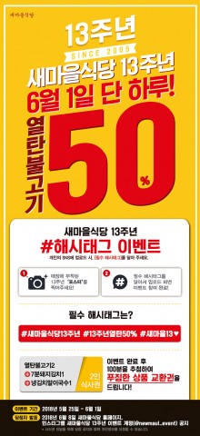 ¶ÇÇÑ »õ¸¶À»½Ä´çÀº 13ÁÖ³â SNS À̺¥Æ®µµ ÇÔ²² ÁøÇàÇÑ´Ù. ¸ÅÀå¿¡ ºÎÂøµÈ ¡®»õ¸¶À»½Ä´ç 13Áֳ⠱â³ä Æ÷½ºÅÍ¡¯¸¦ Âï°í Á¤ÇØÁø ÇØ½Ãű×(#»õ¸¶À»½Ä´ç13ÁÖ³â #13Áֳ⿭ź50% #»õ¸¶À»13¢¾)¸¦ ´Þ¾Æ °³ÀÎ SNS¿¡ ¾÷·ÎµåÇϸé Ãß÷À» ÅëÇÑ 100¸í¿¡°Ô ¸Þ´º ±³È¯±Ç(¿­ÅººÒ°í±â 2 +7ºÐµÅÁö±èÄ¡ 1 +³Ã±èÄ¡¸»À̱¹¼ö 1)À» Á¦°øÇÑ´Ù. ´ç÷ÀÚ´Â 6¿ù 8ÀÏ »õ¸¶À»½Ä´ç ȨÆäÀÌÁö¿Í ÀνºÅ¸±×·¥ »õ¸¶À»½Ä´ç 13ÁÖ³â À̺¥Æ® °èÁ¤¿¡¼­ È®ÀÎ °¡´ÉÇÏ´Ù.